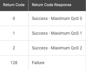 为了确认每一条订阅消息,broker会回复一个SUBACK消息给客户端。这条消息包含着对应的订阅消息的数据包ID,和一系列的返回码。